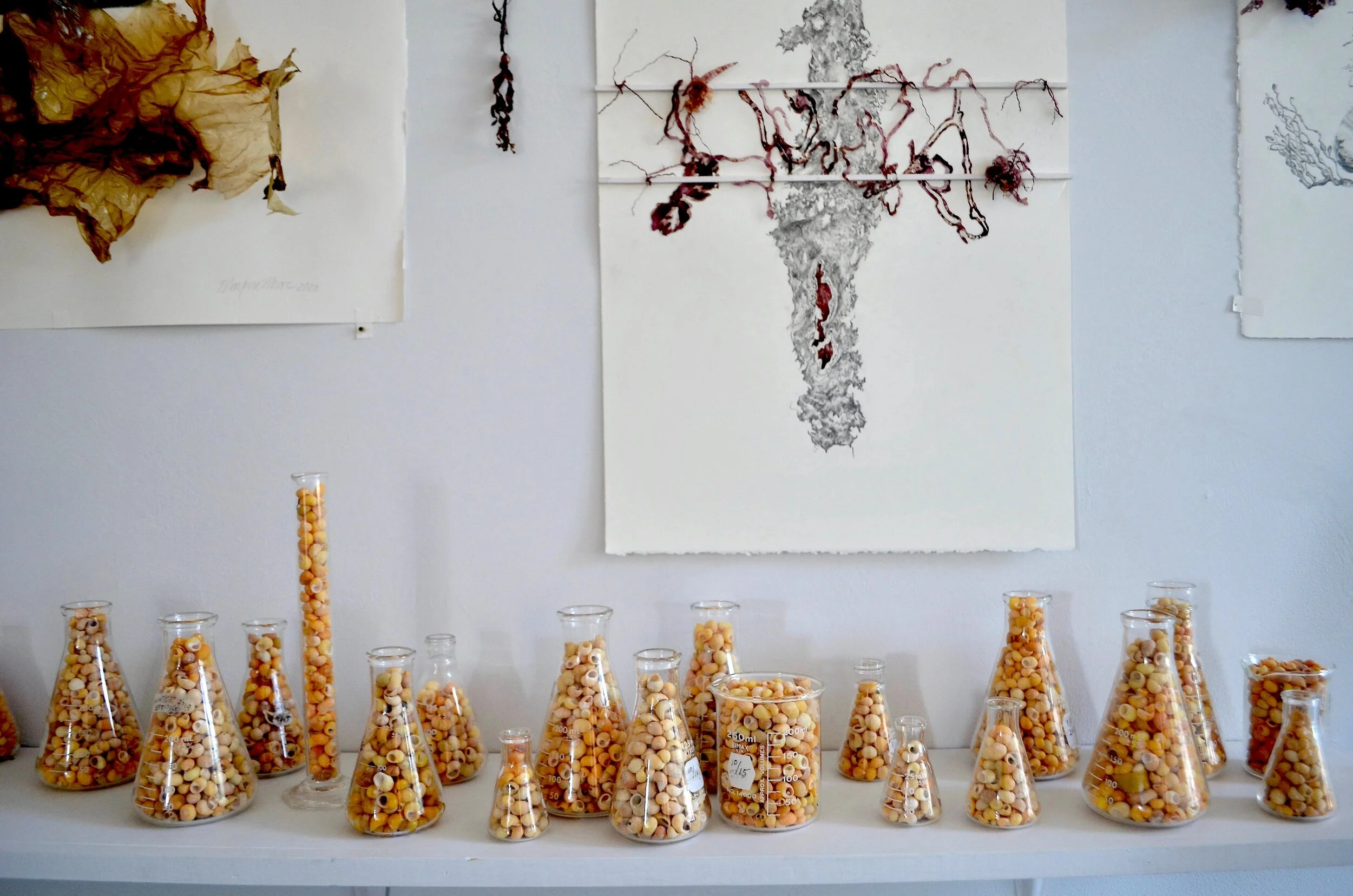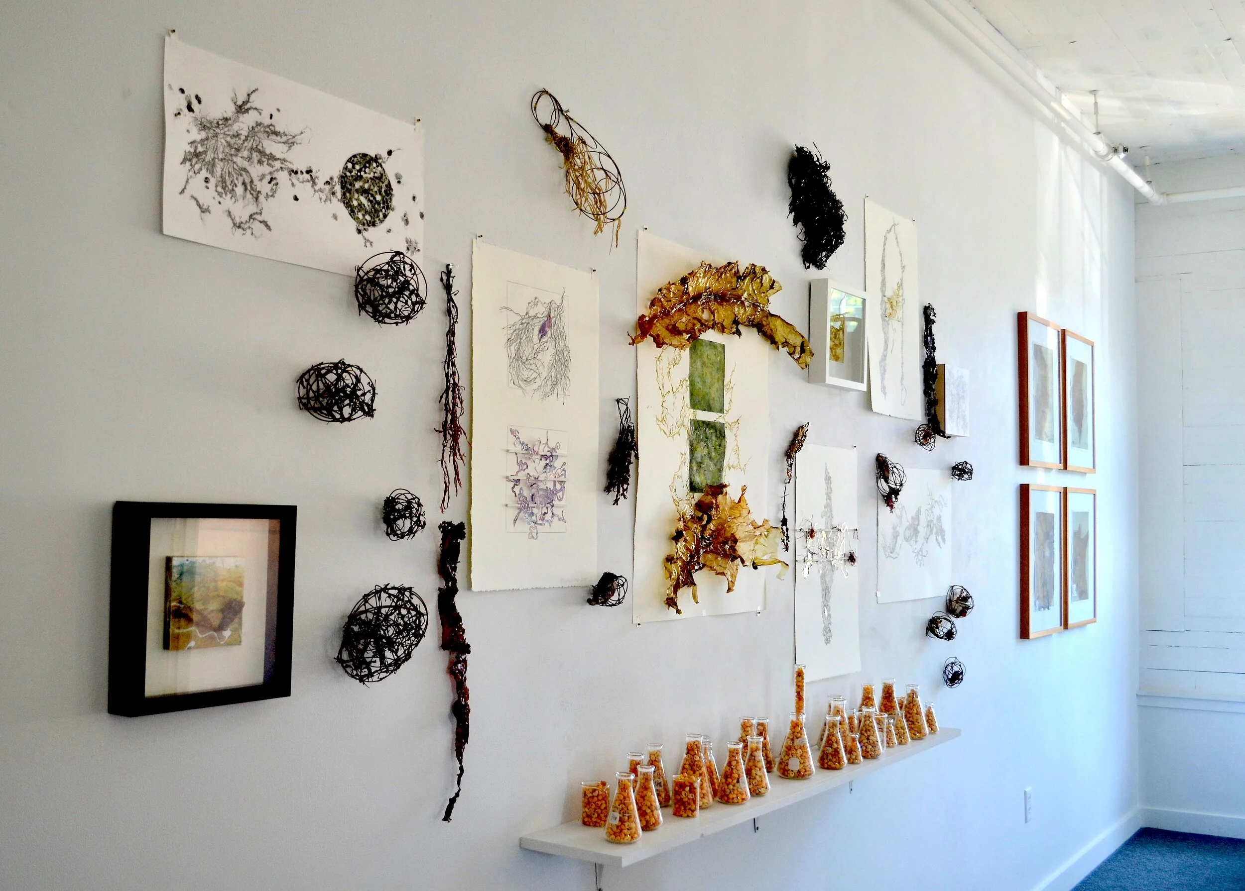 I first created this wall installation for Seaweed Sensibilities to include drawings, paintings, found seaweed, woven seaweed, and what I call ‘tumbles’, which are constructed from rattan. Not yet finished, I finally included beakers of periwinkles, or Littorina obtusata. I have collected these small bright shells on the shores of Great Diamond Island over the last seven years. I am particularly drawn to the yellow ‘winkles’ because they literally feed on the seaweed commonly known as rockweed and formally known as Ascophyllum nodosum.